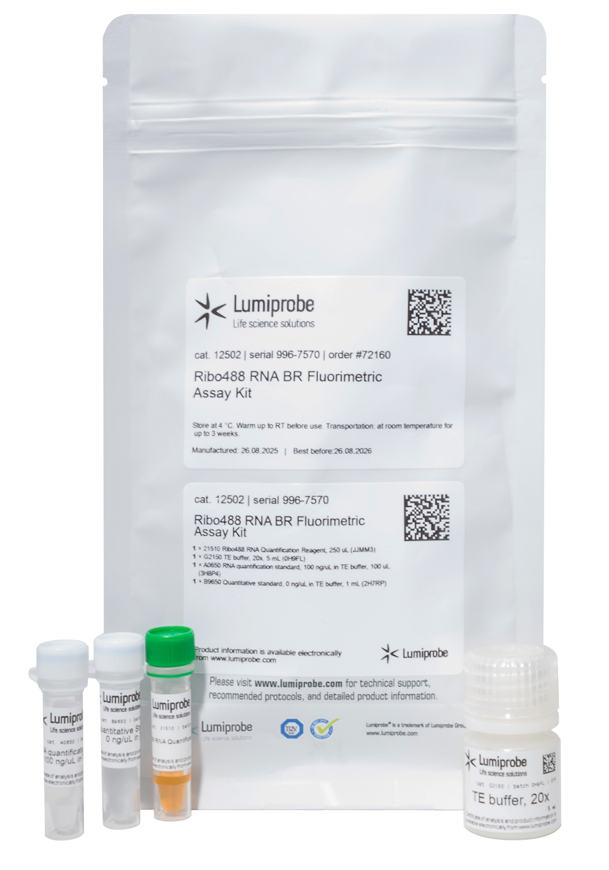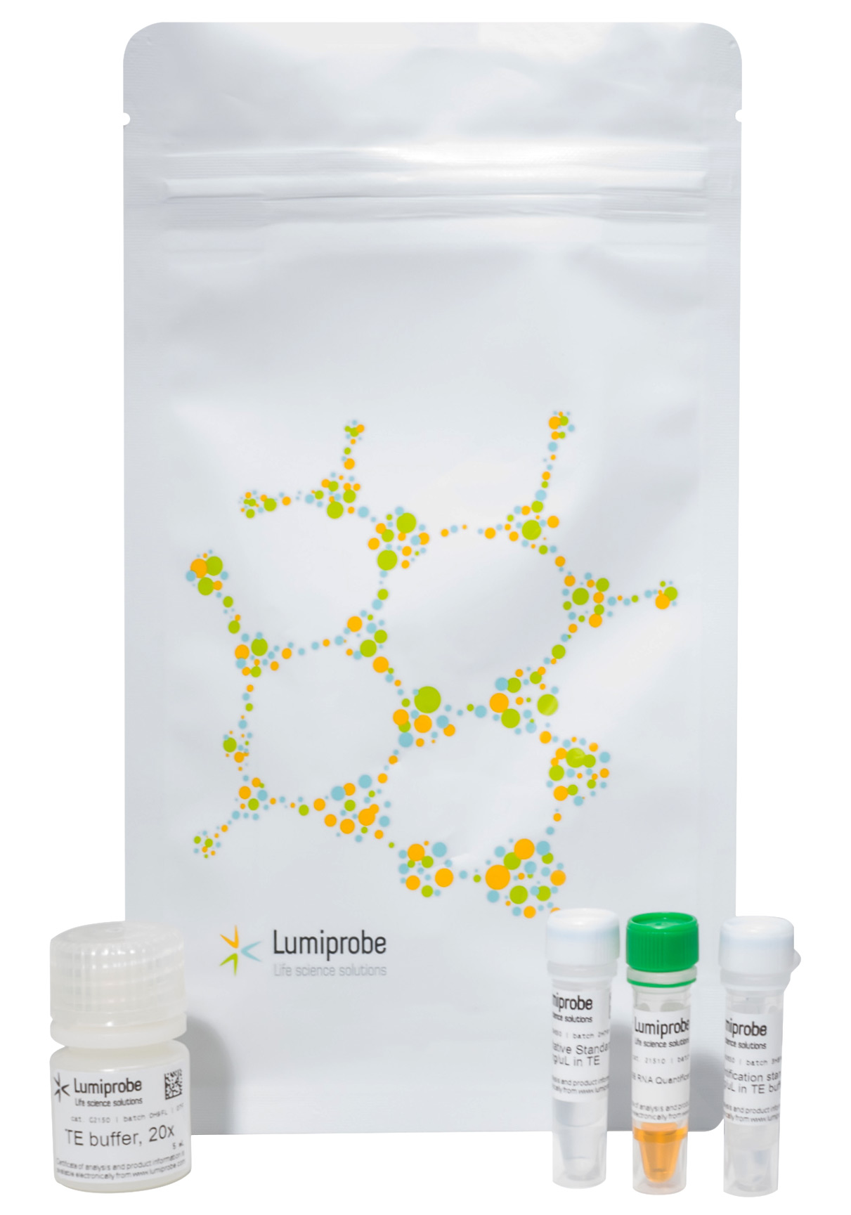 Набор включает в себя 200× концентрат флуоресцентного красителя Ribo488, буфер для приготовления рабочего раствора красителя и стандарты концентрации РНК (0 и 100 нг/мкл).