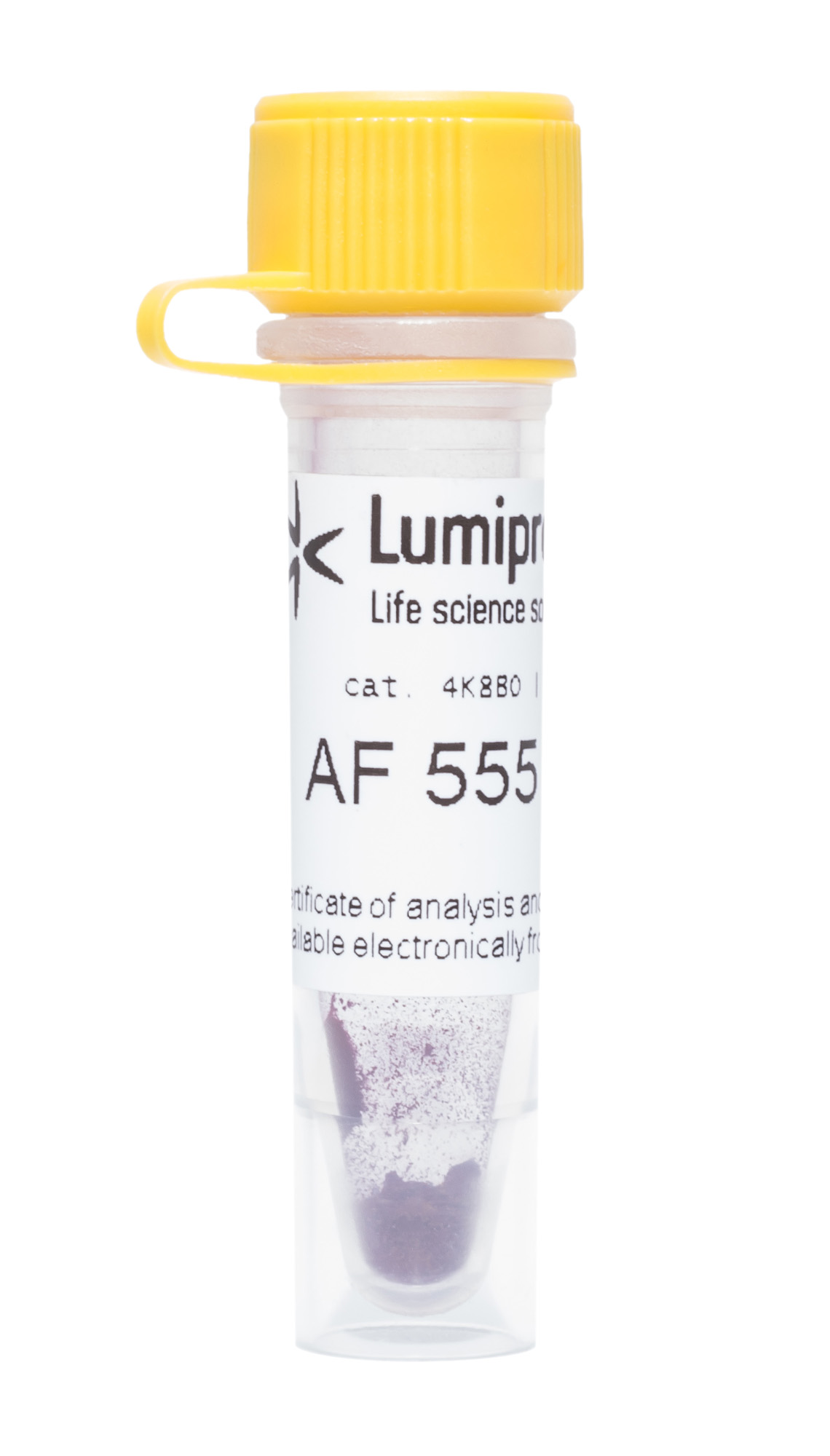 AF 555 алкин возбуждается при ~552 нм и имеет интенсивную флуоресценцию при ~566 нм. Краситель характеризуется высокой яркостью, хорошей фотостабильностью и растворимостью в воде, что делает его идеальным для флуоресцентной микроскопии, проточной цитометрии и высокопроизводительного скрининга. Его спектр возбуждения совместим со стандартными лазерными линиями 532–561 нм.