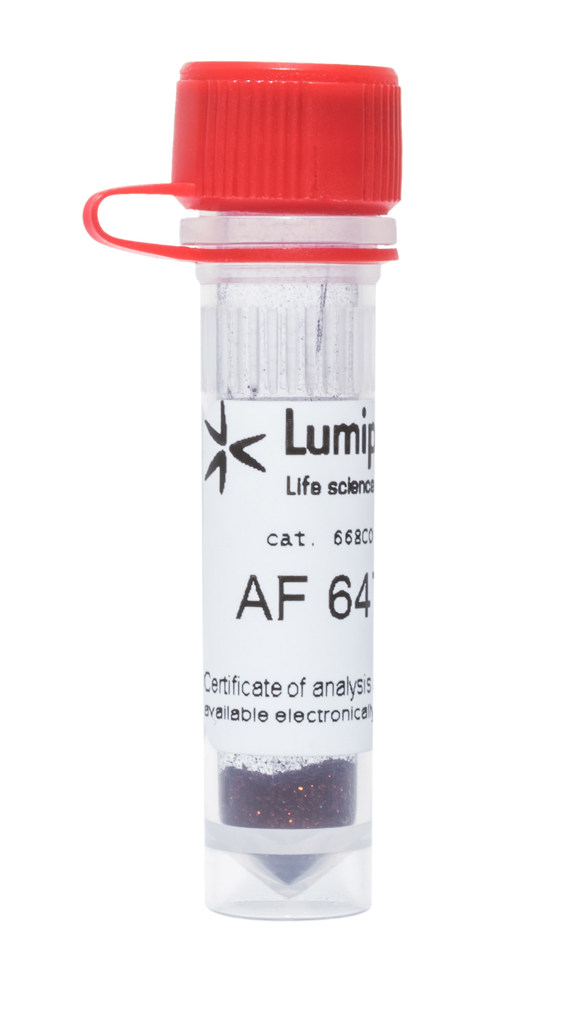 AF 647 — яркий флуоресцентный краситель, излучающий в дальнем красном канале, с высоким квантовым выходом флуоресценции и высокой фотостабильностью. AF 647 — водорастворимый краситель, нечувствительный к рН.