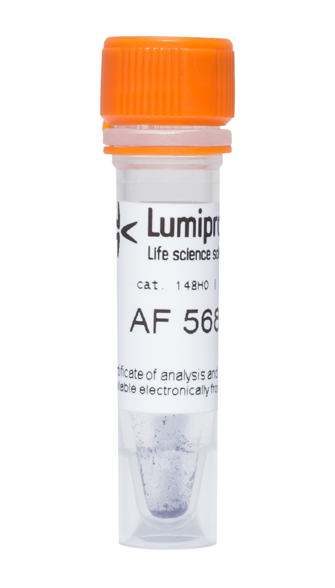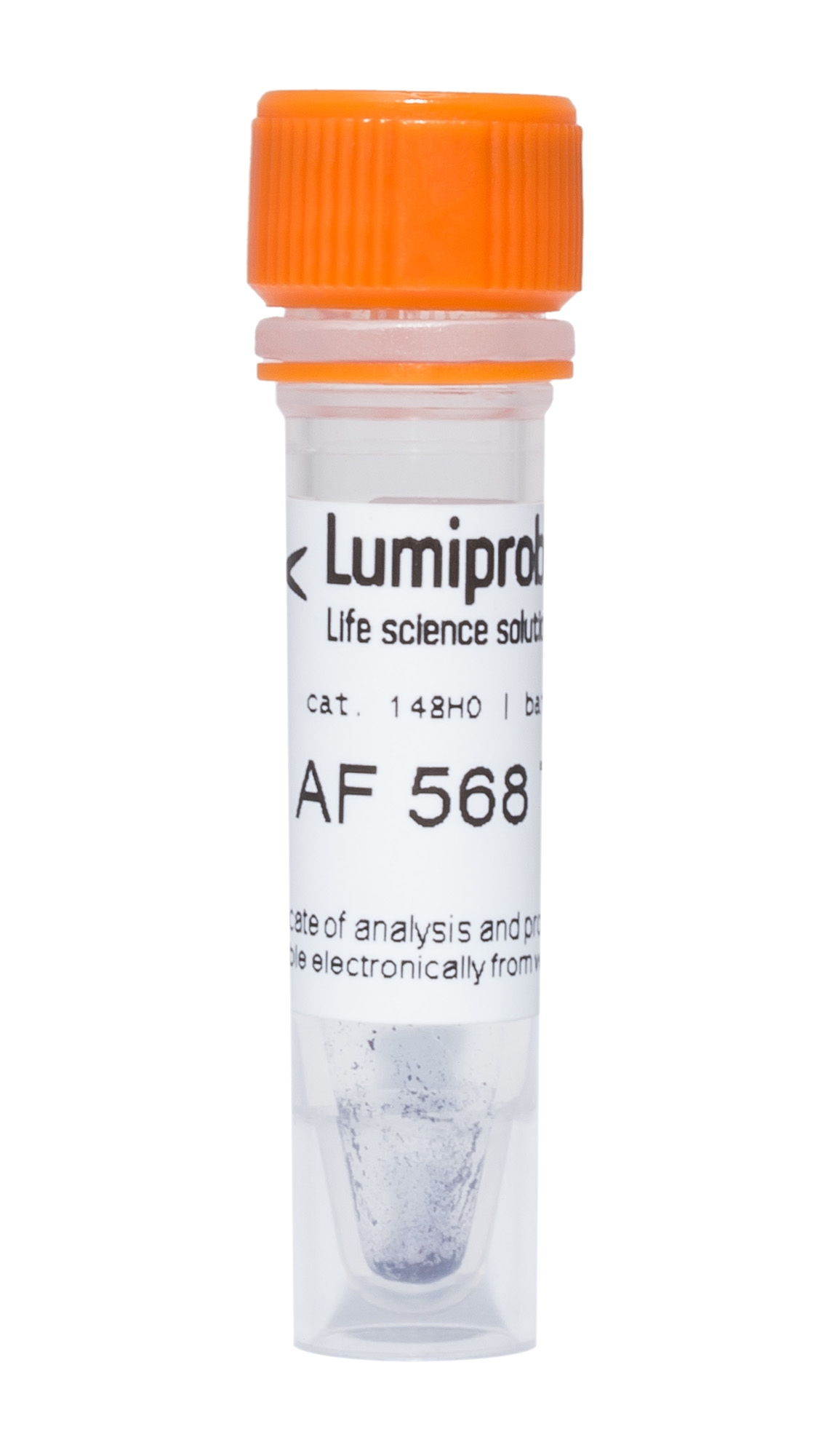 AF 568 ТЦО — яркий фотостабильный краситель, содержащий группу транс-циклооктена (ТЦО) для быстрого биоортогонального мечения. Он сочетает хорошие фотофизические свойства флуорофора AF 568 (оранжево-красную эмиссию, высокий квантовый выход и фотостабильность) с высокой реакционной способностью ТЦО.
