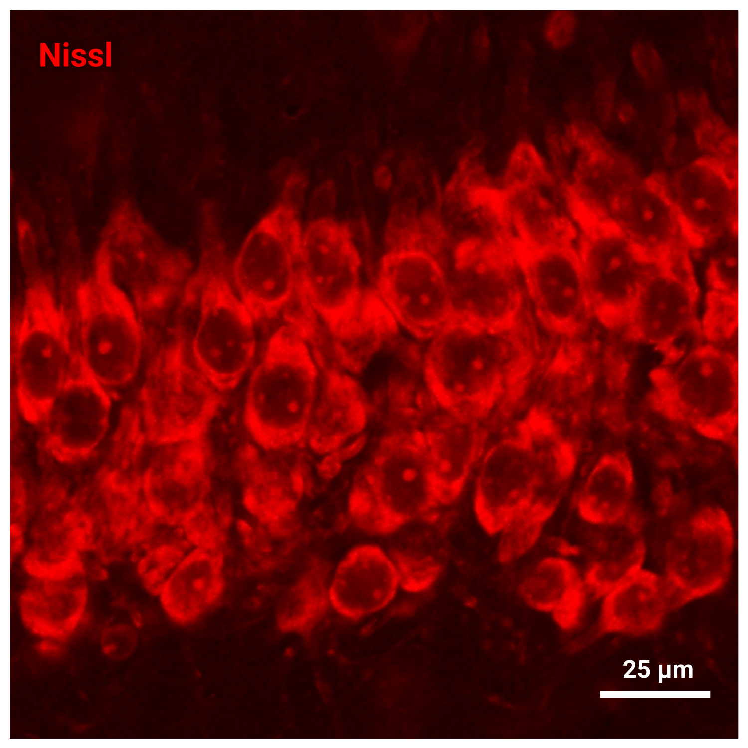 Нейроны поля СА3 гиппокампа, выявленные при помощи красителя Deep-Red Fluorescent Nissl Stain