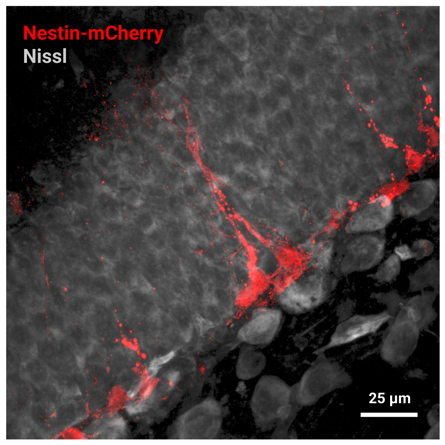 Зубчатая фасция мыши линии Nestin-mCherry, окрашенная по Нисслю с помощью Deep-Red Fluorescent Nissl Stain