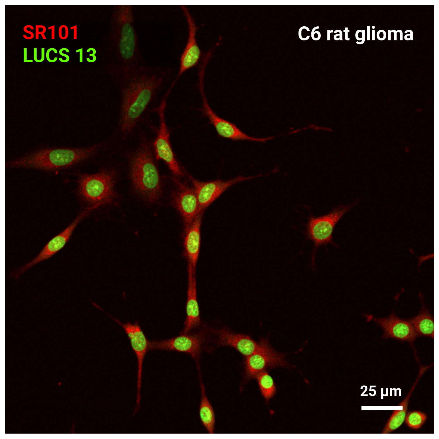При добавлении SR101 к живым клеткам он преимущественно поглощается астроцитами, что обеспечивает чёткую визуализацию их морфологии и целостности сети без необходимости окрашивания нейронов и делает SR101 незаменимым инструментом для исследований функции и цитоархитектуры глиальных клеток in vivo [1].